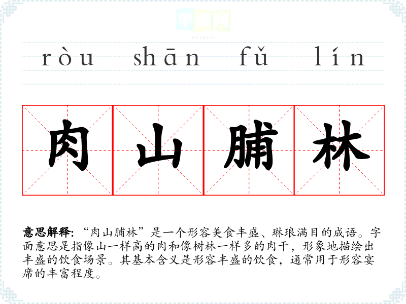 “肉山脯林”是一个形容美食丰盛、琳琅满目的成语。字面意思是指像山一样高的肉和像树林一样多的肉干,形象地描绘出丰盛的饮食场景。其基本含义是形容丰盛的饮食,通常用于形容宴席的丰富程度。