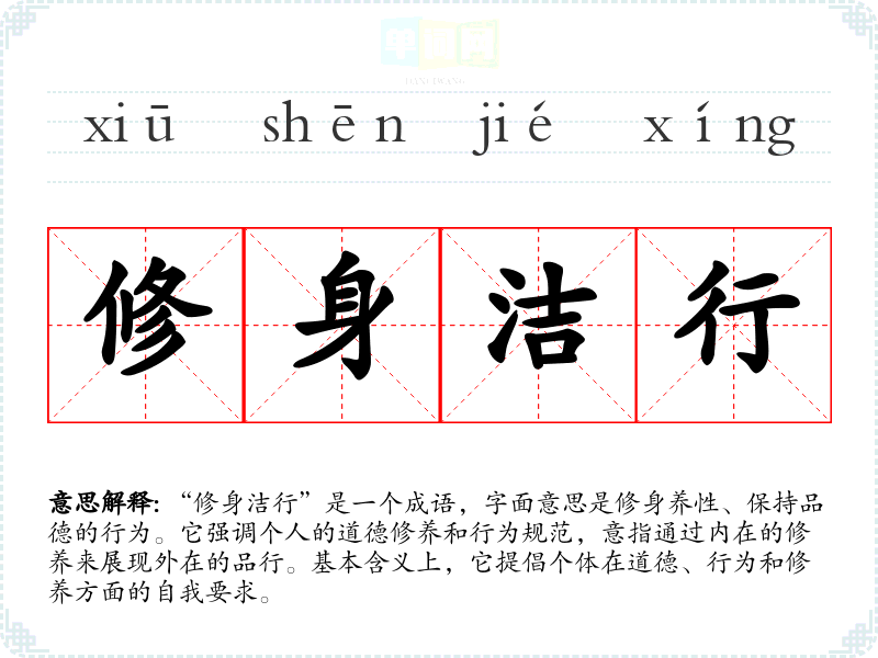 “修身洁行”让我联想到一种内心的宁静与自我约束。它提醒我在面对诱惑时,始终保持清醒的头脑和坚定的信念。在表达上,这个成语常常带有崇高和积极的情感色彩。