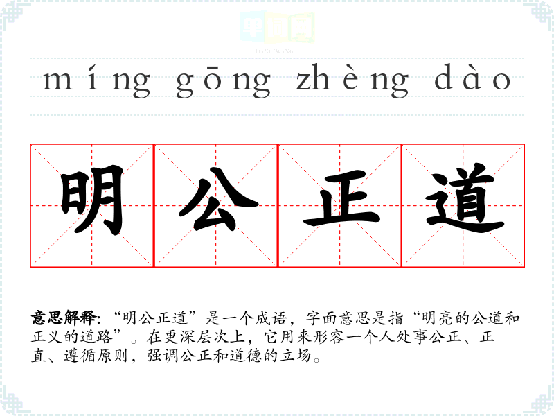 “明公正道”是一个成语,字面意思是指“明亮的公道和正义的道路”。在更深层次上,它用来形容一个人处事公正、正直、遵循原则,强调公正和道德的立场。