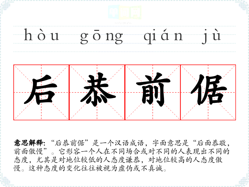 “后恭前倨”是一个汉语成语,字面意思是“后面恭敬,前面傲慢”。它形容一个人在不同场合或对不同的人表现出不同的态度,尤其是对地位较低的人态度谦恭,对地位较高的人态度傲慢。这种态度的变化往往被视为虚伪或不真诚。