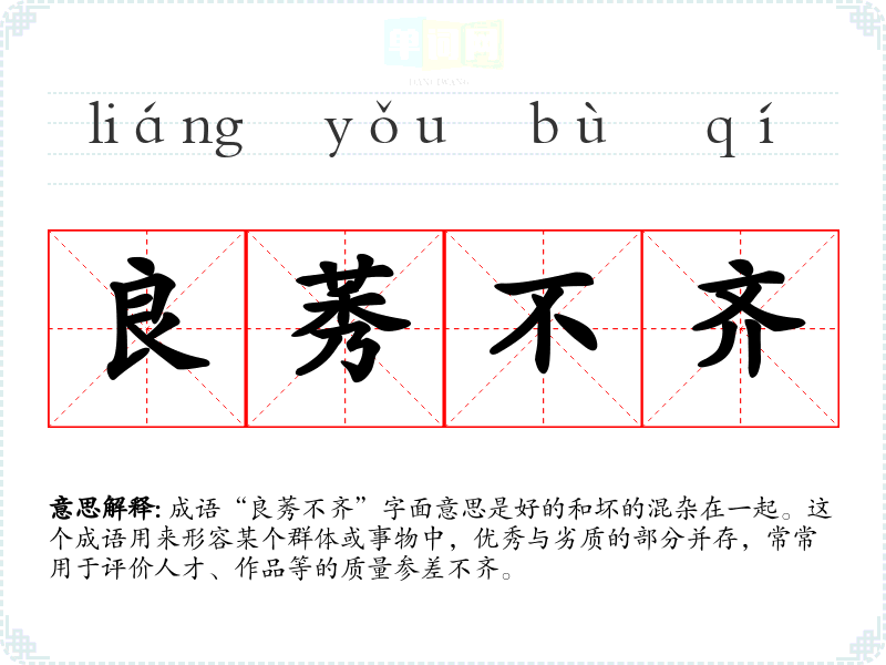 成语“良莠不齐”字面意思是好的和坏的混杂在一起。这个成语用来形容某个群体或事物中,优秀与劣质的部分并存,常常用于评价人才、作品等的质量参差不齐。