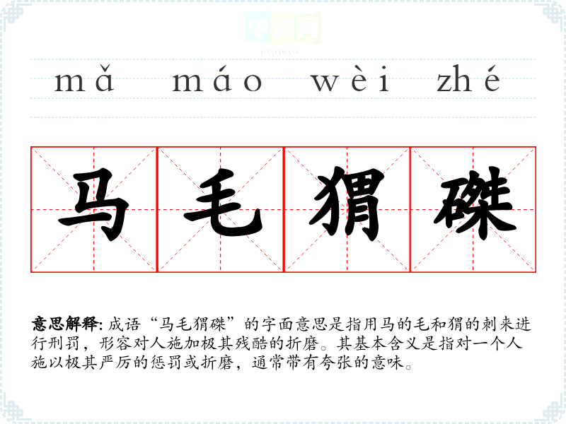 成语“马毛猬磔”的字面意思是指用马的毛和猬的刺来进行刑罚,形容对人施加极其残酷的折磨。其基本含义是指对一个人施以极其严厉的惩罚或折磨,通常带有夸张的意味。