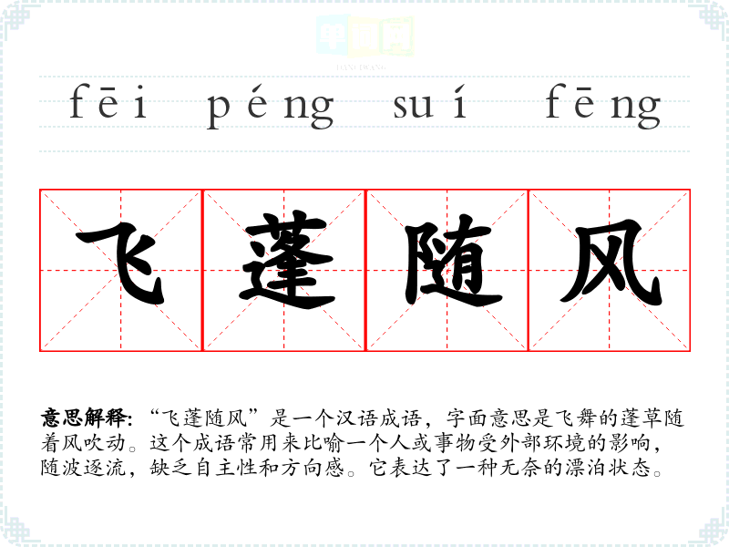 “飞蓬随风”是一个汉语成语,字面意思是飞舞的蓬草随着风吹动。这个成语常用来比喻一个人或事物受外部环境的影响,随波逐流,缺乏自主性和方向感。它表达了一种无奈的漂泊状态。