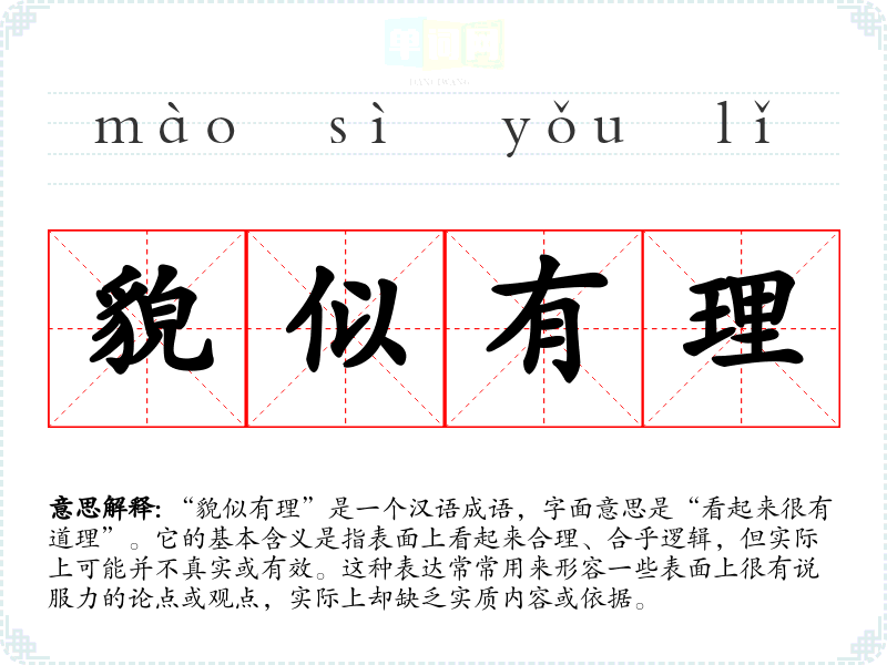 | 貌似有理 | 貌:表面。表面上看好像有道理。形容实际上没有道理,表面却像很有道理的样子。 |