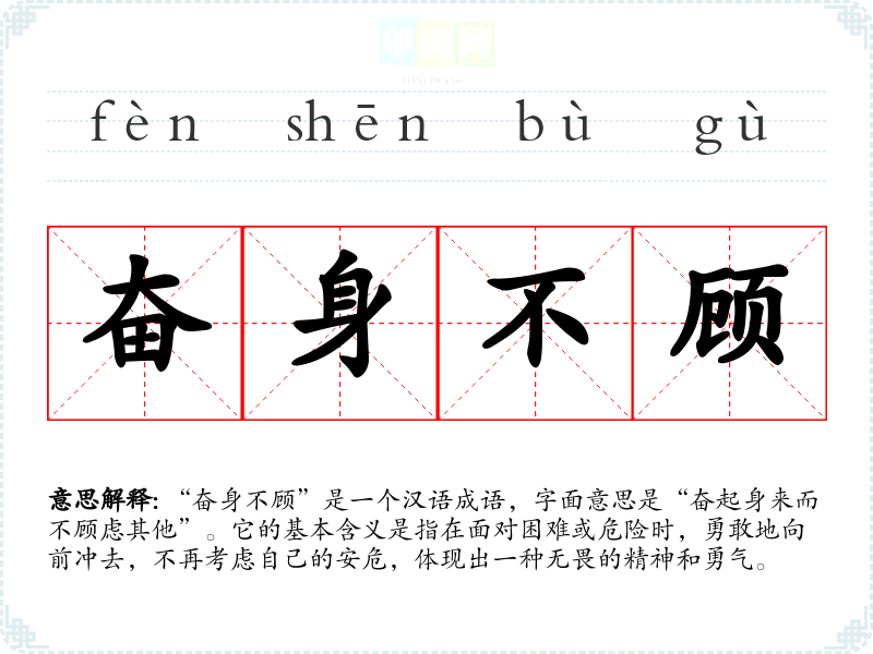 “奋身不顾”是一个汉语成语,字面意思是“奋起身来而不顾虑其他”。它的基本含义是指在面对困难或危险时,勇敢地向前冲去,不再考虑自己的安危,体现出一种无畏的精神和勇气。