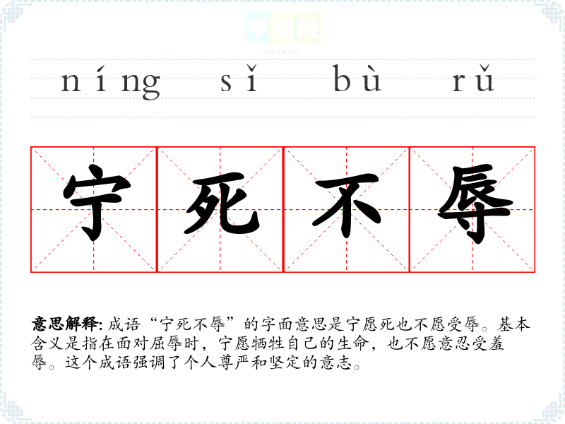 成语“宁死不辱”的字面意思是宁愿死也不愿受辱。基本含义是指在面对屈辱时,宁愿牺牲自己的生命,也不愿意忍受羞辱。这个成语强调了个人尊严和坚定的意志。