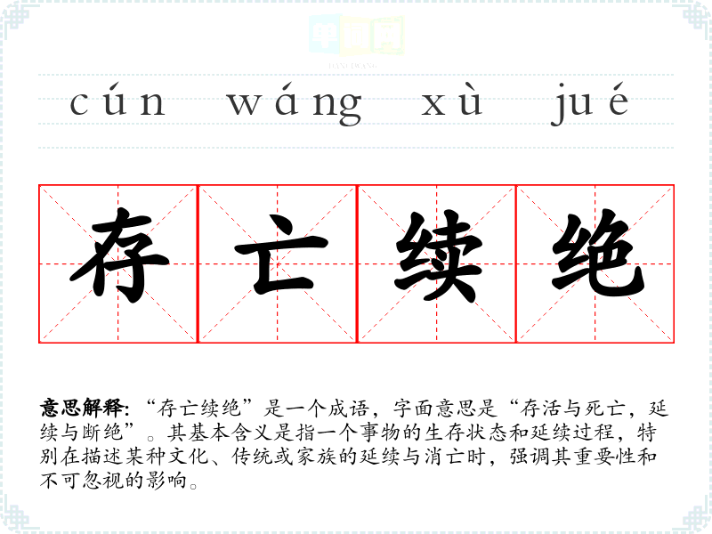 “存亡续绝”源自于古代文献,强调的是事物的生死存亡与延续断绝。这个成语可能与古代对家族、文化、国家等延续的重视有关,特别是在历史的变迁中,许多文化、家族都经历了存亡的考验。虽然具体的文献出处较为模糊,但其内涵在历史和文化背景中是非常显著的。