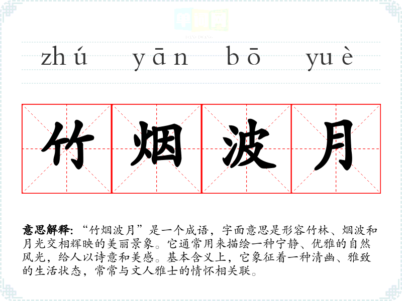 “竹烟波月”是一个成语,字面意思是形容竹林、烟波和月光交相辉映的美丽景象。它通常用来描绘一种宁静、优雅的自然风光,给人以诗意和美感。基本含义上,它象征着一种清幽、雅致的生活状态,常常与文人雅士的情怀相关联。