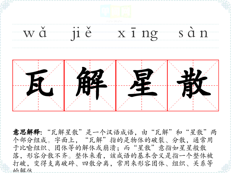 “瓦解星散”并没有明确的历史典故或文学出处,通常被认为是现代汉语中较为常用的组合式成语。其构成部分“瓦解”早在古文中就有使用,例如《左传》中提到“瓦解”的意象,而“星散”则更常见于描绘景象的文学作品中。因此,该成语的形成可以看作是对古典汉语中相关意象的现代化组合。