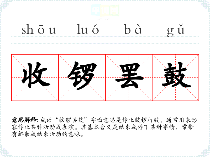成语“收锣罢鼓”字面意思是停止敲锣打鼓,通常用来形容停止某种活动或表演。其基本含义是结束或停下某种事情,常带有解散或结束活动的意味。