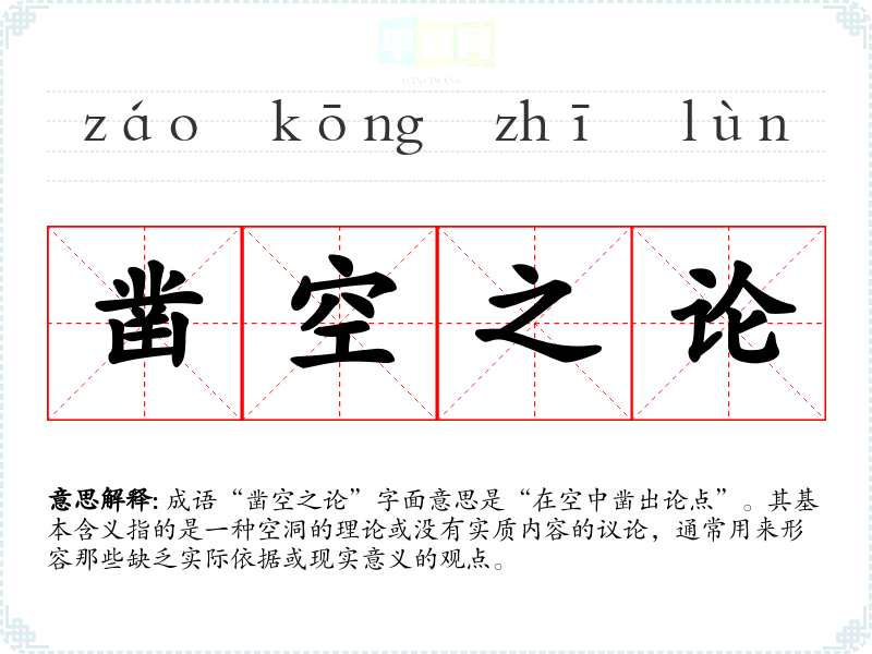 成语“凿空之论”字面意思是“在空中凿出论点”。其基本含义指的是一种空洞的理论或没有实质内容的议论,通常用来形容那些缺乏实际依据或现实意义的观点。