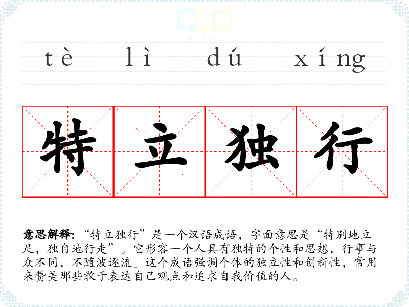 “特立独行”是一个汉语成语,字面意思是“特别地立足,独自地行走”。它形容一个人具有独特的个性和思想,行事与众不同,不随波逐流。这个成语强调个体的独立性和创新性,常用来赞美那些敢于表达自己观点和追求自我价值的人。