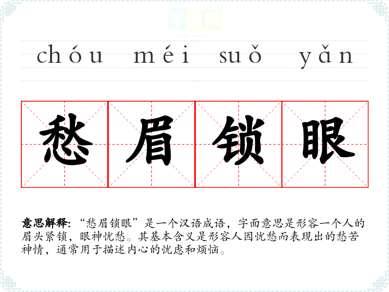 “愁眉锁眼”是一个汉语成语,字面意思是形容一个人的眉头紧锁,眼神忧愁。其基本含义是形容人因忧愁而表现出的愁苦神情,通常用于描述内心的忧虑和烦恼。
