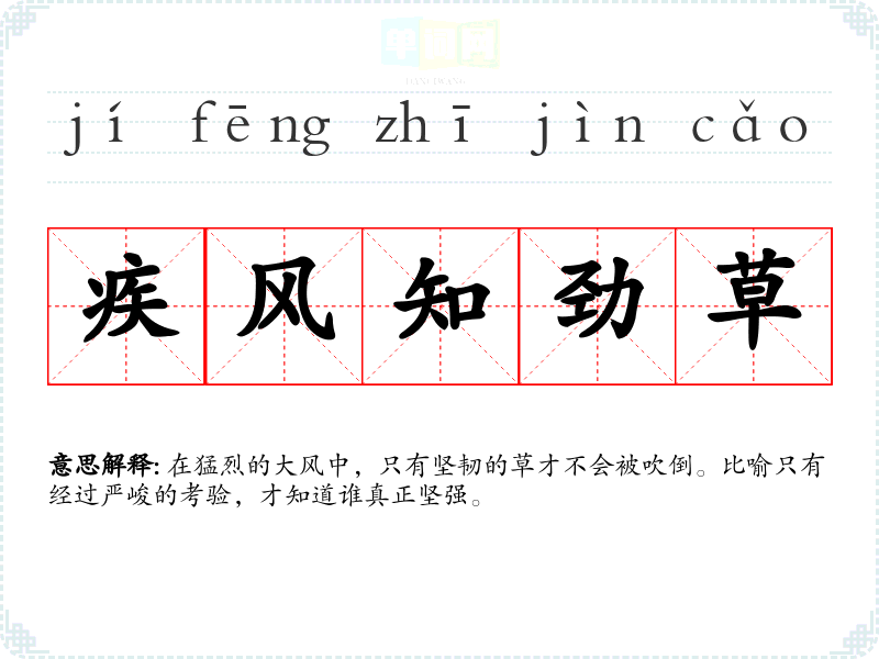 | 疾风知劲草 | 在猛烈的大风中,只有坚韧的草才不会被吹倒。比喻只有经过严峻的考验,才知道谁真正坚强。 |