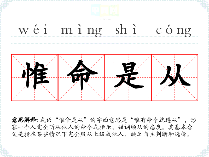 | 唯命是从 | 唯:唯独。是命令就服从。形容完全服从命令 |
