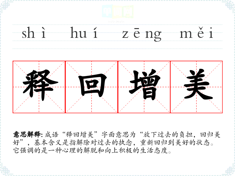 成语“释回增美”字面意思为“放下过去的负担,回归美好”,基本含义是指解除对过去的执念,重新回归到美好的状态。它强调的是一种心理的解脱和向上积极的生活态度。