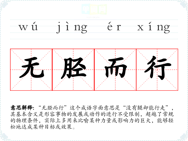 “无胫而行”这个成语字面意思是“没有腿却能行走”,其基本含义是形容事物的发展或动作的进行不受限制,超越了常规的物理条件,实际上多用来比喻某种力量或影响力的巨大,能够轻松地达成某种目标或效果。