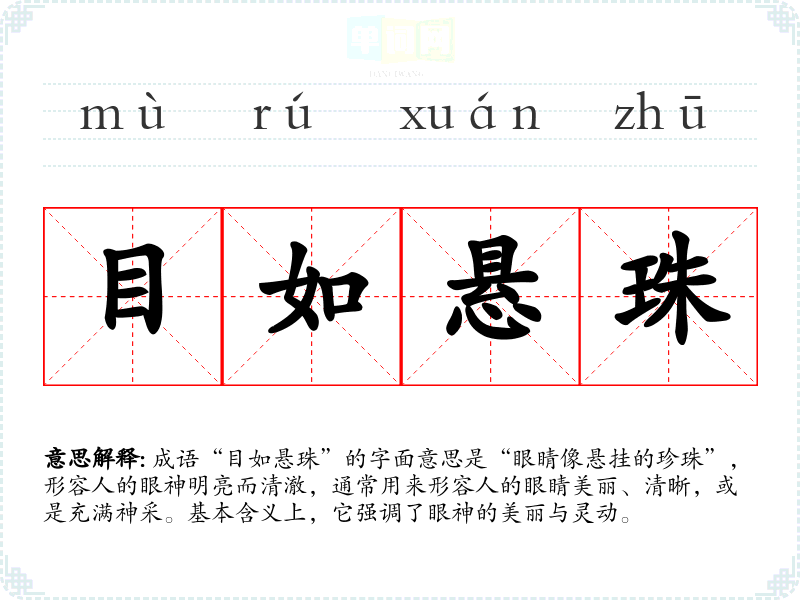 成语“目如悬珠”的字面意思是“眼睛像悬挂的珍珠”,形容人的眼神明亮而清澈,通常用来形容人的眼睛美丽、清晰,或是充满神采。基本含义上,它强调了眼神的美丽与灵动。