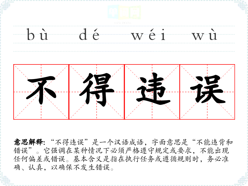 这个成语的具体历史来源并不明确,但从字面上可以看出,它主要由“不得”、“违”和“误”三部分构成。“不得”表示禁止,“违”表示违背,“误”表示错误。该成语可能源于对某些严谨性的要求,例如法律、纪律、规章制度等方面的强调。