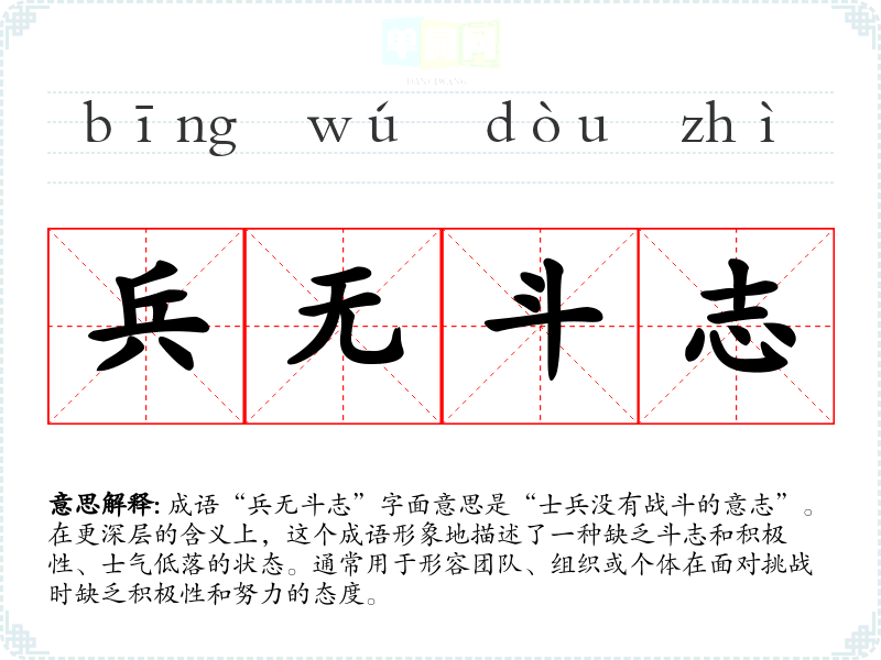 成语“兵无斗志”字面意思是“士兵没有战斗的意志”。在更深层的含义上,这个成语形象地描述了一种缺乏斗志和积极性、士气低落的状态。通常用于形容团队、组织或个体在面对挑战时缺乏积极性和努力的态度。