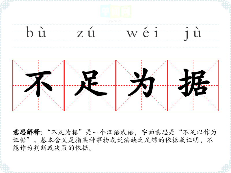 “不足为据”是一个汉语成语,字面意思是“不足以作为证据”。基本含义是指某种事物或说法缺乏足够的依据或证明,不能作为判断或决策的依据。