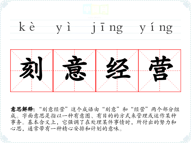 “刻意经营”这个成语由“刻意”和“经营”两个部分组成。字面意思是指以一种有意图、有目的的方式来管理或运作某种事务。基本含义上,它强调了在处理某件事情时,所付出的努力和心思,通常带有一种精心安排和计划的意味。