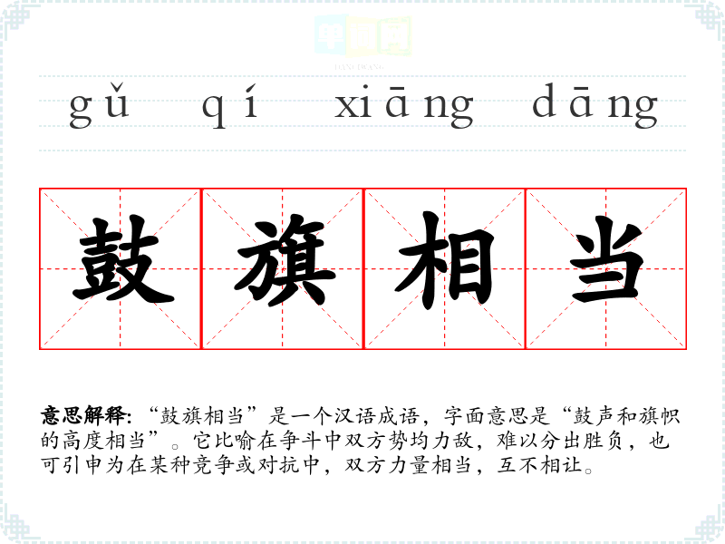 “鼓旗相当”是一个汉语成语,字面意思是“鼓声和旗帜的高度相当”。它比喻在争斗中双方势均力敌,难以分出胜负,也可引申为在某种竞争或对抗中,双方力量相当,互不相让。