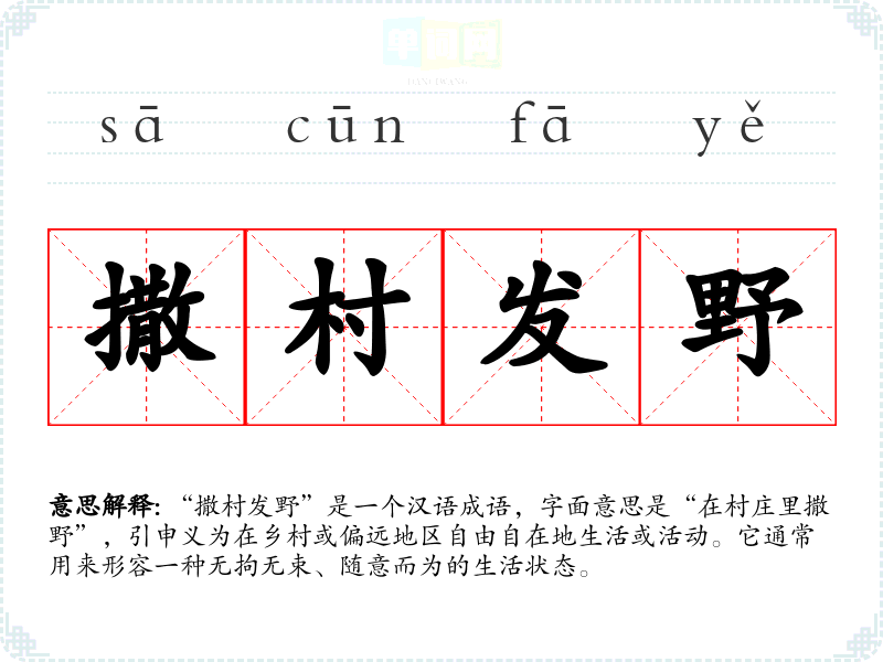 “撒村发野”是一个汉语成语,字面意思是“在村庄里撒野”,引申义为在乡村或偏远地区自由自在地生活或活动。它通常用来形容一种无拘无束、随意而为的生活状态。