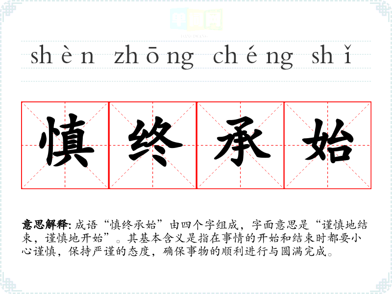 | 慎终承始 | 谨慎收尾,如同开始时一样。指始终要谨慎从事。同“慎终如始”。 |
