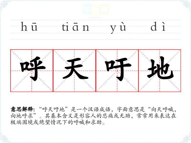 “呼天吁地”是一个汉语成语,字面意思是“向天呼喊,向地呼求”。其基本含义是形容人的悲痛或无助,常常用来表达在极端困境或绝望情况下的呼喊和求助。
