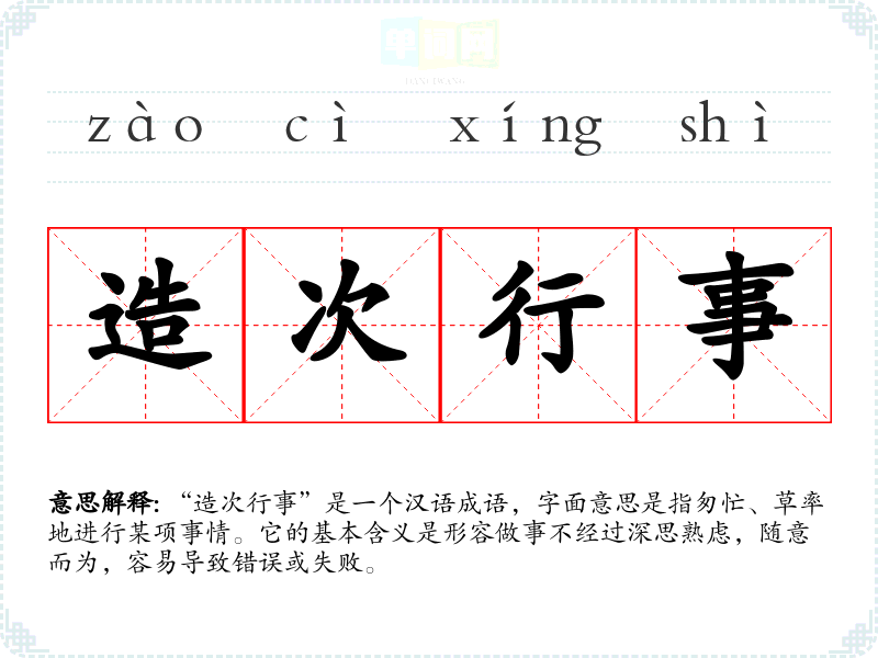 “造次行事”是一个汉语成语,字面意思是指匆忙、草率地进行某项事情。它的基本含义是形容做事不经过深思熟虑,随意而为,容易导致错误或失败。