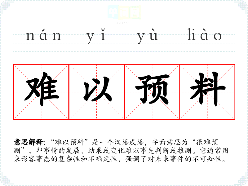 “难以预料”并没有明确的历史典故或文学出处,而是一个常用的汉语表达。它的构成由“难以”和“预料”两个部分组成。“难以”表示困难或不容易,“预料”则是指预计、预测。因此,这个成语的流行反映了人们对未来事务的无奈和对不可控因素的认识。