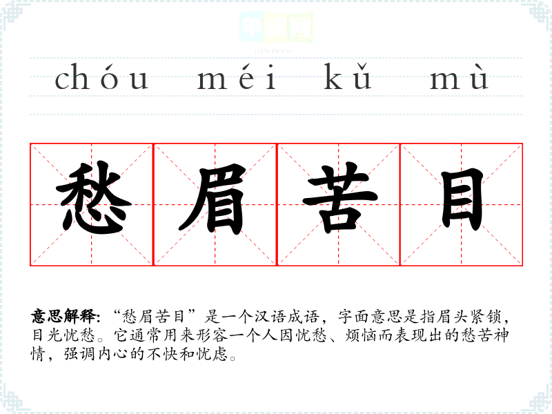 “愁眉苦目”是一个汉语成语,字面意思是指眉头紧锁,目光忧愁。它通常用来形容一个人因忧愁、烦恼而表现出的愁苦神情,强调内心的不快和忧虑。