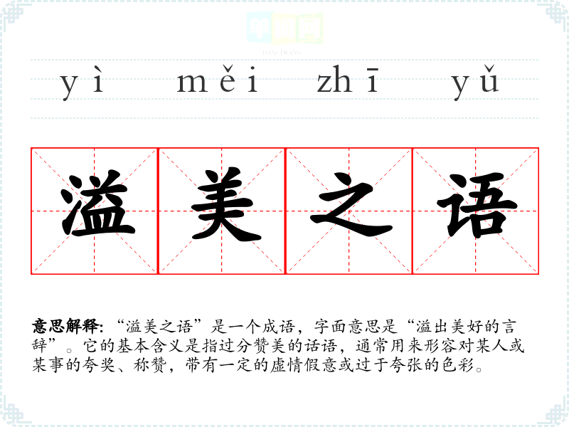 “溢美之语”是一个成语,字面意思是“溢出美好的言辞”。它的基本含义是指过分赞美的话语,通常用来形容对某人或某事的夸奖、称赞,带有一定的虚情假意或过于夸张的色彩。