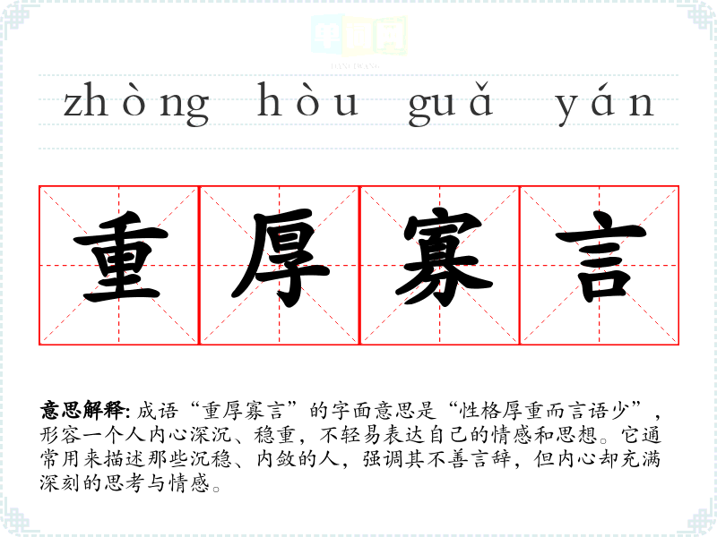 成语“重厚寡言”的字面意思是“性格厚重而言语少”,形容一个人内心深沉、稳重,不轻易表达自己的情感和思想。它通常用来描述那些沉稳、内敛的人,强调其不善言辞,但内心却充满深刻的思考与情感。