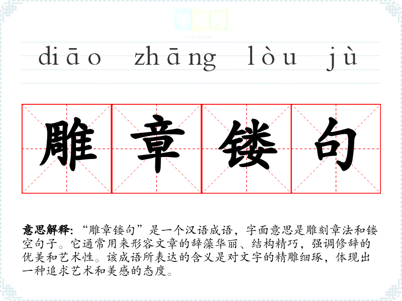 “雕章镂句”出自《后汉书·王允传》,其中提到“风采飘逸,雕章镂句”,形容王允的文章风格独特,辞藻华丽。这一成语强调了对文字的精致加工和修饰,反映出古代文人对文学创作的追求和热爱。