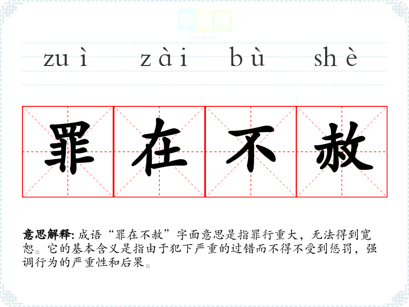 - 同义成语:罪不可赦、罪无可恕。它们都强调了对严重过错的不可宽恕性。