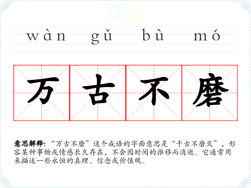 “万古不磨”这个成语的字面意思是“千古不磨灭”,形容某种事物或情感长久存在,不会因时间的推移而消逝。它通常用来描述一些永恒的真理、信念或价值观。
