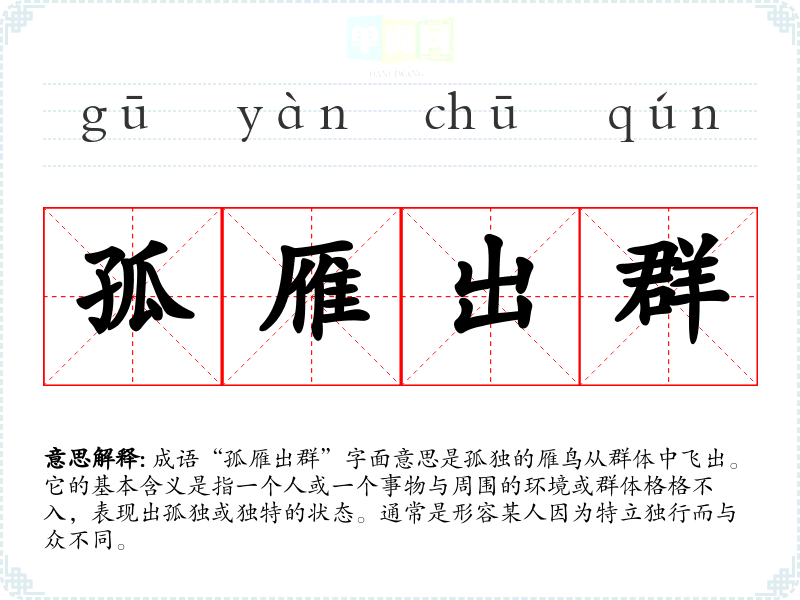 在**文化中,孤雁常常象征着孤独、离别和思乡之情。在现代社会中,随着个体主义的兴起,越来越多的人开始欣赏与众不同的特立独行。这个成语可以用来鼓励人们勇于追求自己的梦想,而不必随波逐流。