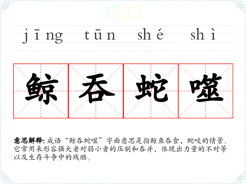 成语“鲸吞蛇噬”字面意思是指鲸鱼吞食,蛇咬的情景。它常用来形容强大者对弱小者的压制和吞并,体现出力量的不对等以及生存斗争中的残酷。