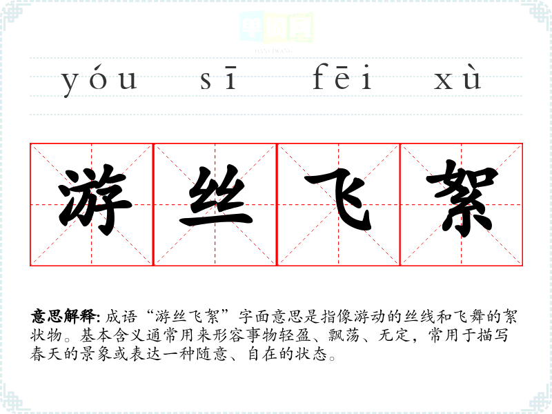 成语“游丝飞絮”字面意思是指像游动的丝线和飞舞的絮状物。基本含义通常用来形容事物轻盈、飘荡、无定,常用于描写春天的景象或表达一种随意、自在的状态。