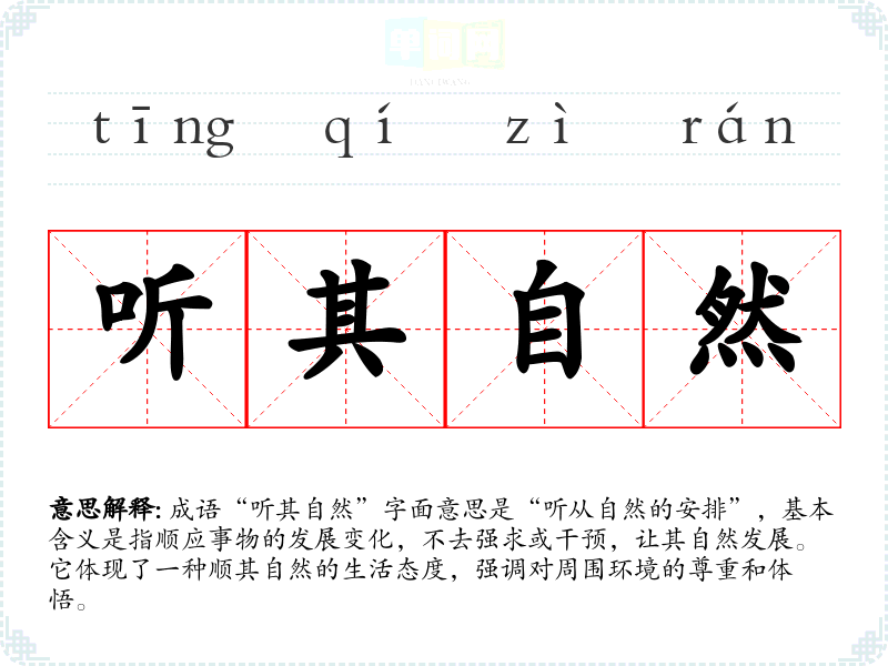 成语“听其自然”字面意思是“听从自然的安排”,基本含义是指顺应事物的发展变化,不去强求或干预,让其自然发展。它体现了一种顺其自然的生活态度,强调对周围环境的尊重和体悟。