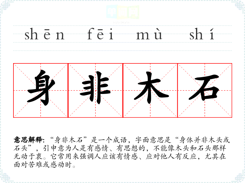 “身非木石”是一个成语,字面意思是“身体并非木头或石头”,引申意为人是有感情、有思想的,不能像木头和石头那样无动于衷。它常用来强调人应该有情感、应对他人有反应,尤其在面对苦难或感动时。