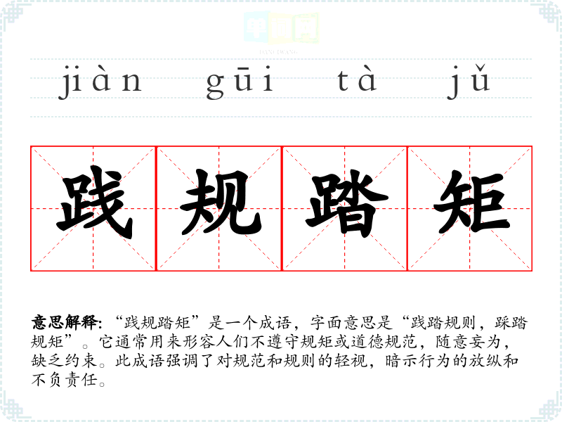 “践规踏矩”是一个成语,字面意思是“践踏规则,踩踏规矩”。它通常用来形容人们不遵守规矩或道德规范,随意妄为,缺乏约束。此成语强调了对规范和规则的轻视,暗示行为的放纵和不负责任。