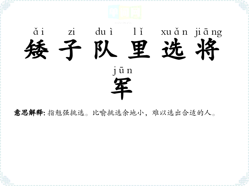 | 矮子队里选将军 | 指勉强挑选。比喻挑选余地小,难以选出合适的人。 |