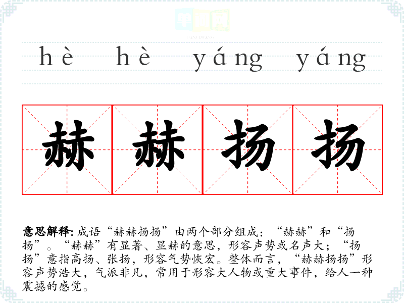 | 赫赫扬扬 | 赫赫:显赫的样子。①光明盛大的样子。②形容兴旺显赫。 |