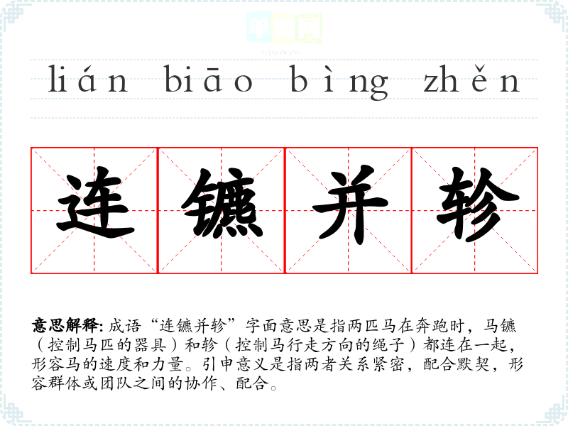 “连镳并轸”最早出现在《后汉书·张衡传》。该成语描述了马车在行驶时,前后马匹配合得非常好,体现了团队合作的精神。随着时间的推移,这一成语逐渐演变为形容人与人之间、团队与团队之间的紧密配合。