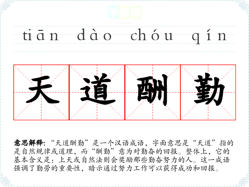 “天道酬勤”是一个汉语成语,字面意思是“天道”指的是自然规律或道理,而“酬勤”意为对勤奋的回报。整体上,它的基本含义是:上天或自然法则会奖励那些勤奋努力的人。这一成语强调了勤劳的重要性,暗示通过努力工作可以获得成功和回报。
