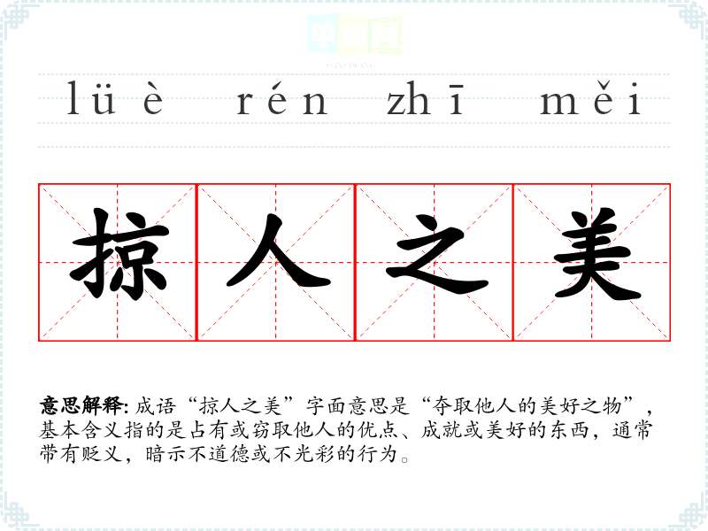 成语“掠人之美”字面意思是“夺取他人的美好之物”,基本含义指的是占有或窃取他人的优点、成就或美好的东西,通常带有贬义,暗示不道德或不光彩的行为。