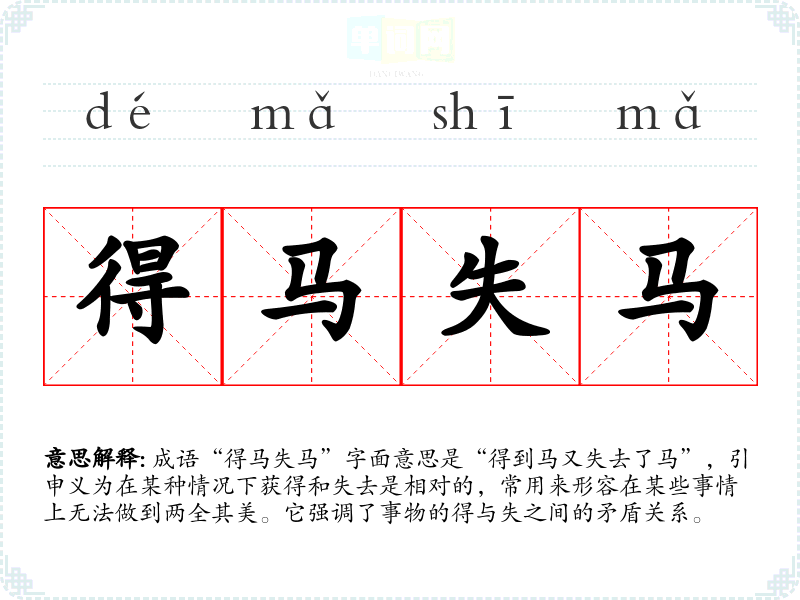 成语“得马失马”字面意思是“得到马又失去了马”,引申义为在某种情况下获得和失去是相对的,常用来形容在某些事情上无法做到两全其美。它强调了事物的得与失之间的矛盾关系。